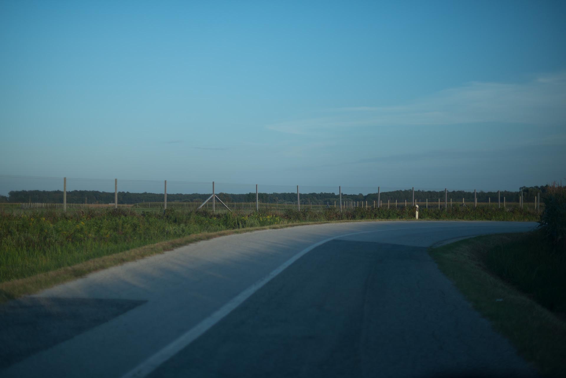 The 2 teams meet up in VIRJE. Interview near Virje with Tomislav's neighbor, Zlatko B., at his vineyard house. He is retired, but still works dispersing clouds to fight against weather-based crop destruction. On the Drava near NOVO VIRJE there are no fences. In ŽDALA, a Hungarian village in Croatia, the fence goes along the village. We follow a dead-end street to find a ruined and abandoned state border security facility that was used by the army and the cavalry as a rest area and was closed down in 2000. We find no traces of migrants. We're filming wire and razor wire fence there. We go to the local Flamingo cafe to interview the council president and cafe owner. He offers us his land for sleeping overnight.