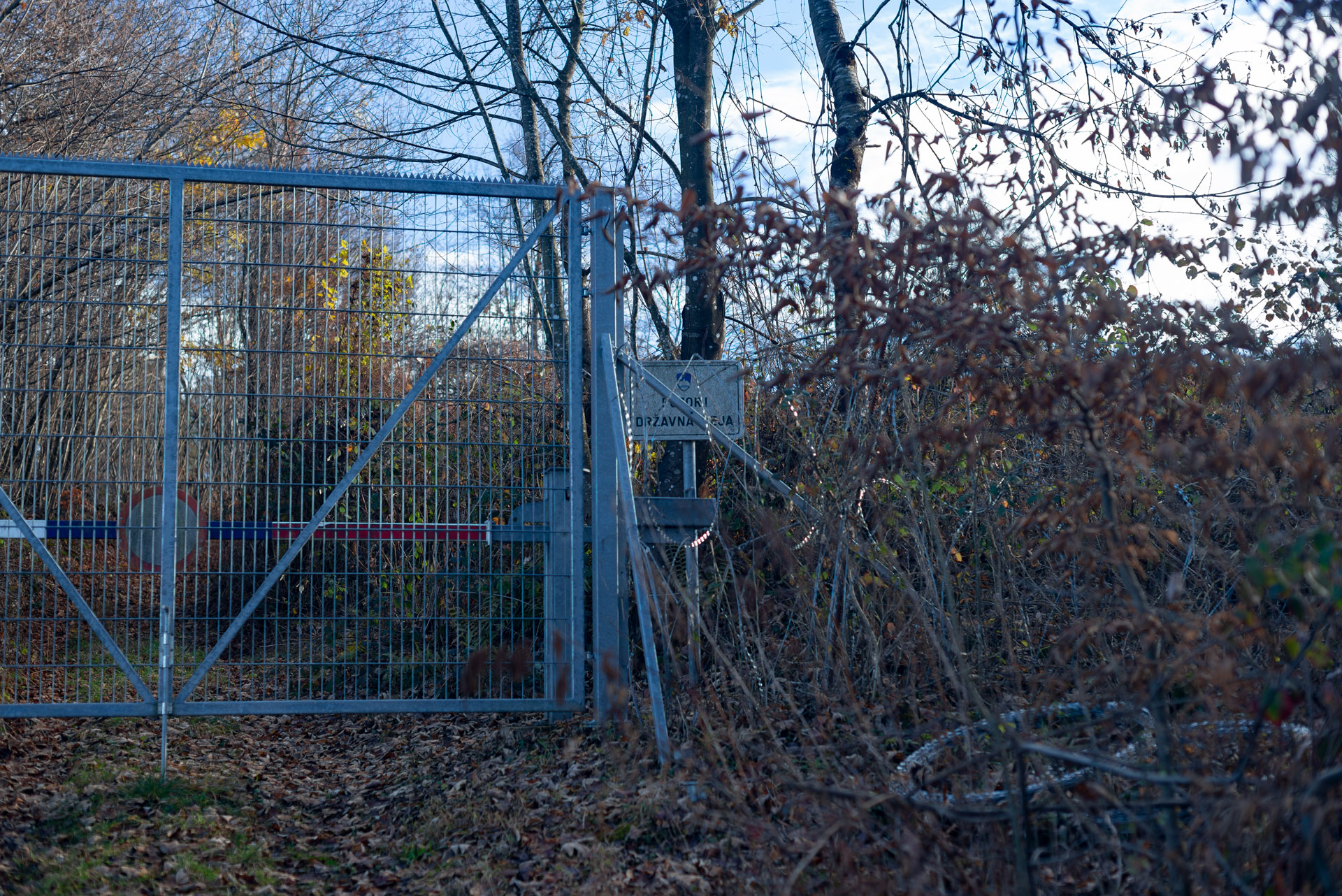 There is a bridge crossed by the local border, a closed crossing in SLO (Mirtovići). A door with spikes was installed, a razor wire and traffic was suspended. This was, as a policeman in Čabar told us, the only crossing and road in the area because the road on the Croatian side was built only 2 years ago. We photograph and film the bridge.