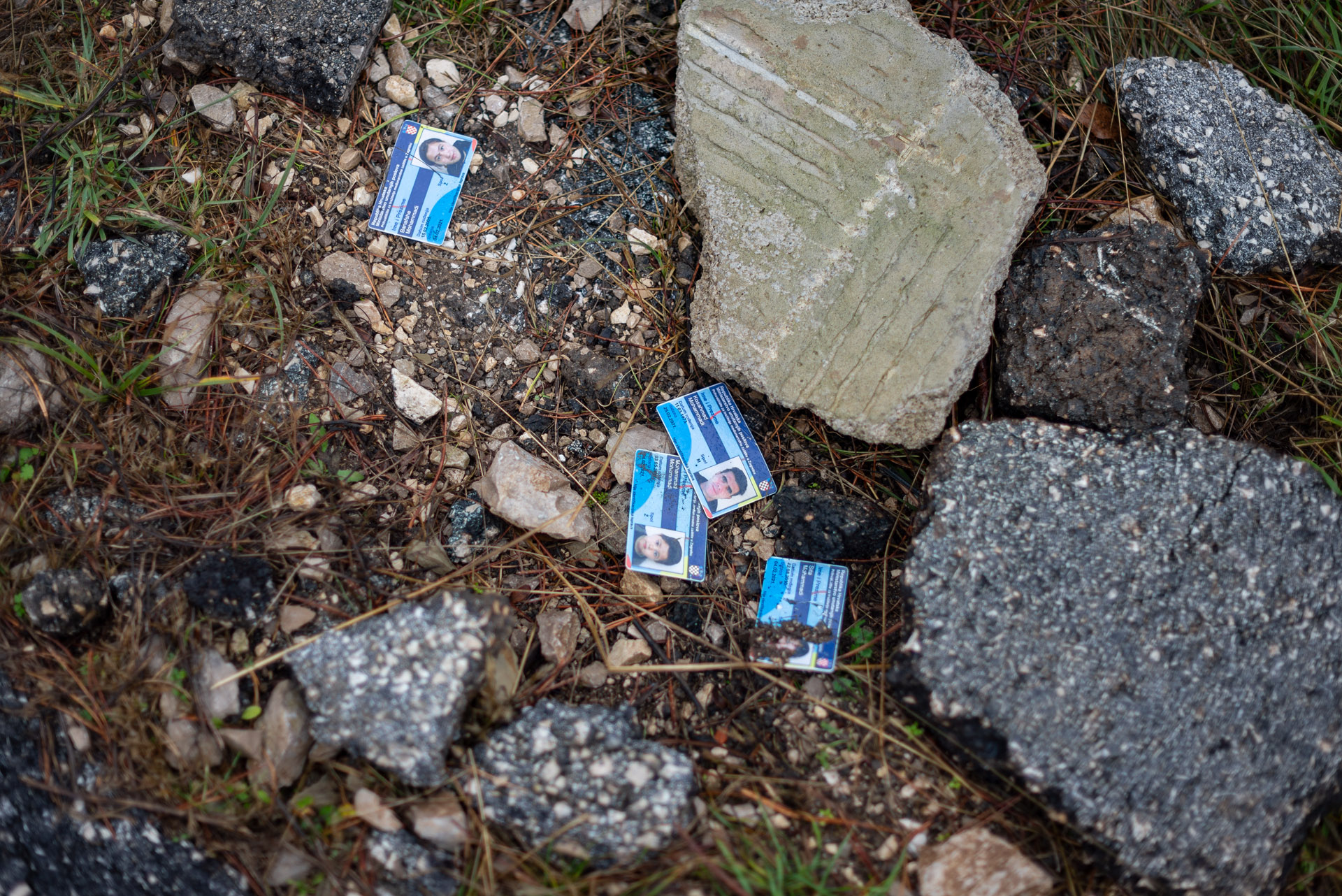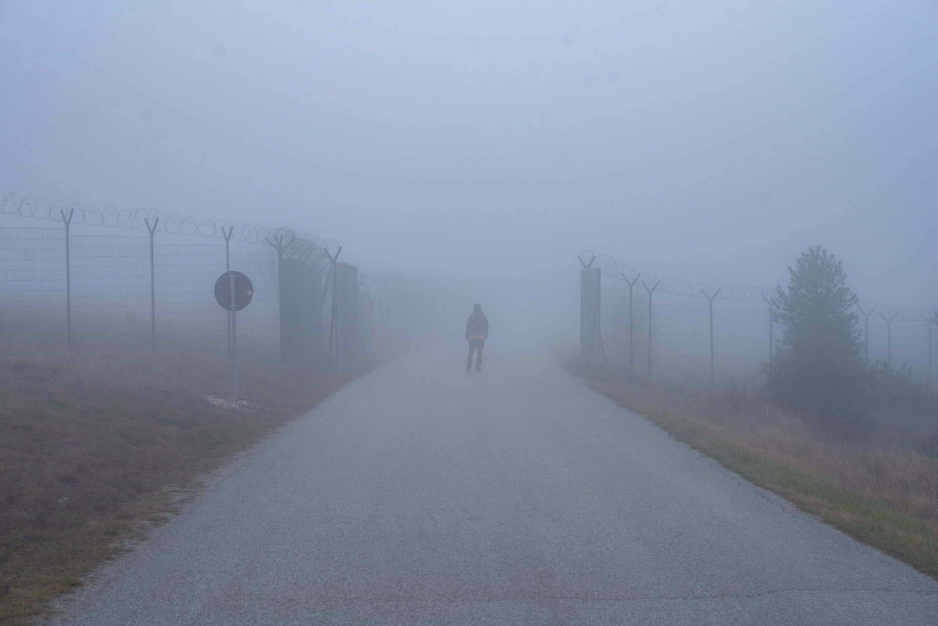 From Rovinj village we go to Roč, Caffe Roč, coffee. We go to the border crossing Rakitovec which was mentioned to us by a waitress from Carpe Diem in Rupa. It's foggy, we're shooting in the fog, videos and photos, we find discarded documents from the whole family of migrants from Afghanistan. This is where the road enters Slovenia and exits again. A fence panel and razor wire are placed on both sides of the road, like a tunnel.